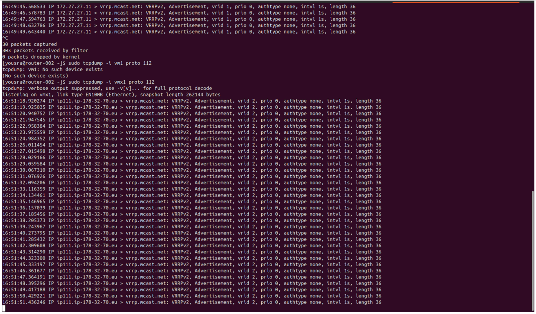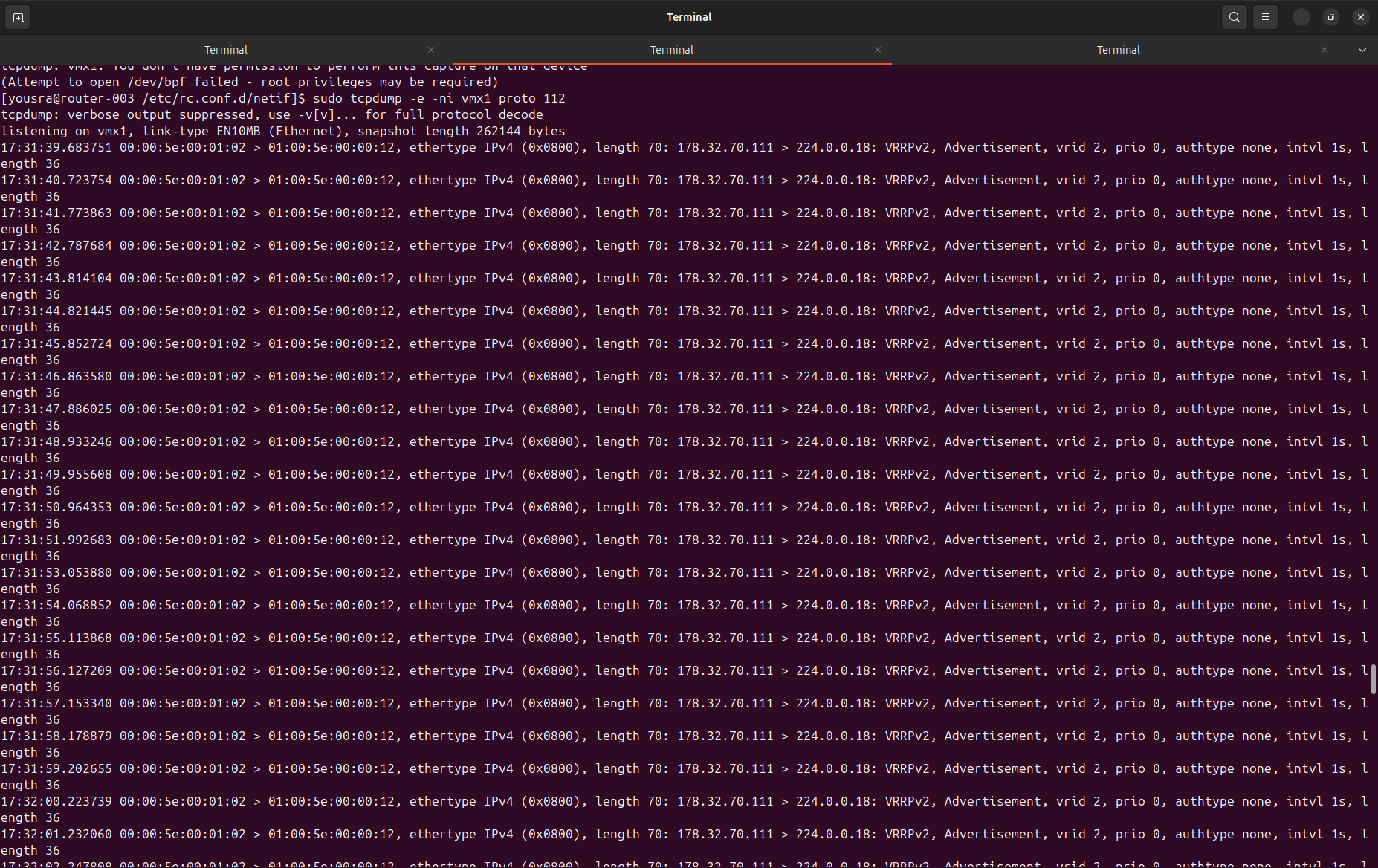 command : tcpdump -e -ni vmx1 proto 112