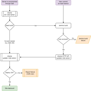 Sites are published to Alkane by a Jenkins job running on CD. Again for privilege separation, Jenkins uses different containers per site to build the site artefact.